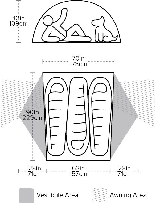 Big Agnes Copper Spur HV UL3 Tent er helt symmetrisk omkring en midterakse på langs af teltet, hvor en indgang med tovejs lynlås og en rummelig apsis i hver side af teltet gør, at man ikke behøver kravle over alle de sovende, når man om natten skal have forrettet sin nødtørft. Inderteltet måler i hovedenden 178 cm. i bredden og i fodenden 157 cm, medens længden er 224 cm. og højden er op til hele 109 cm!
