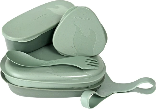 Light My Fire LunchKit BIO™ indeholder to trekantede tallerkener, en dyb og en flad – som altså samtidig udgør bunden og låget – den geniale en Spork Original BIO™, hvor der er ske i den ene ende og gaffel i den anden og et savtakket skær på den ene side af gaflen, som derfor udgør en kniv. Derudover er der fundet plads til et par vandtætte SnapBox™ -beholdere på hhv. 170 og 320 ml. til de ting, der helst skal forblive tørre, som fx kiks, mel eller sukker. Og alt sammen altså fremstillet i bæredygtigt bioplast, der belaster miljøet mindst muligt.