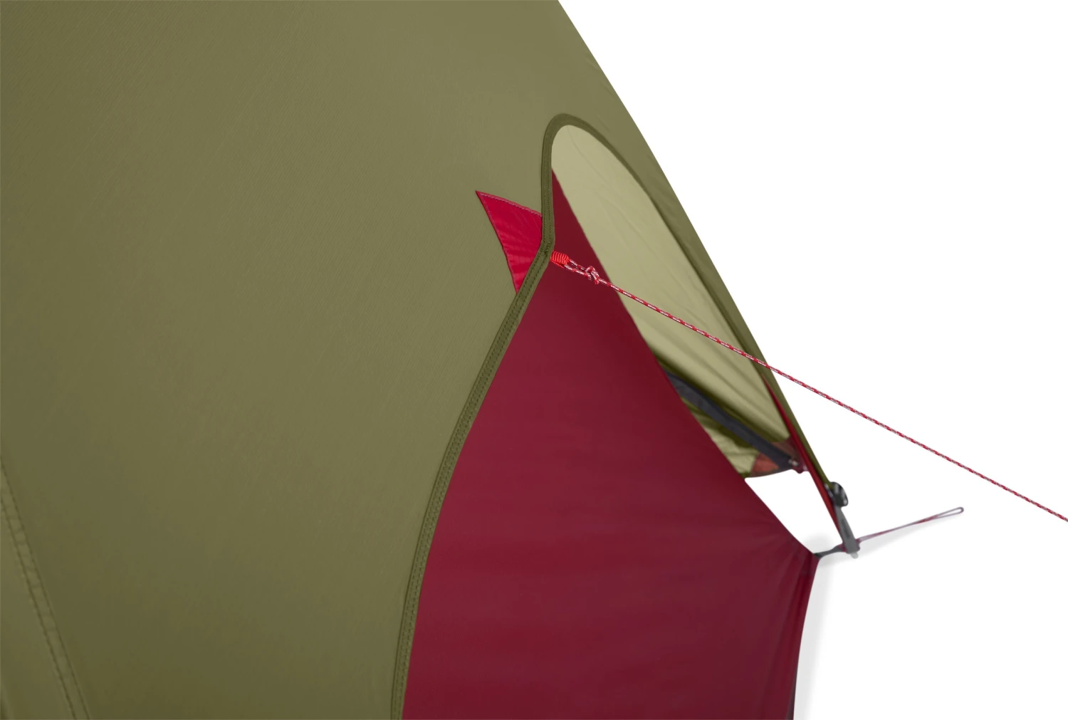 Oversejlet er med justerbare og farvekodede pløk- og bardunfæste og lavet i en anden variant af det ekstremt lette 15D Nylon Ripstop Durahield™, som MSR selv har udviklet. Og det er det letteste tekstil, der nogensinde er fremstillet til teltoversejl, når man sammenholder med riv-, slidstyrke og vandtæthed! Dette letvægtsmateriale er PU-belagt indvendigt og udvendigt behandlet med en silikoneelastomer, så man ikke går på kompromis med hverken slidstyrke eller vandtæthed. Indgang til apsis og sovekabinen sker gennem en stor, tovejs lynlåslukket dør i siden af oversejlet, som ligeledes kan rulles til siden og fikseres, og den geniale StayDry™ -konstruktion består af nogle særlige tagrender ved indgangsdøren, så vandet fra oversejlet ikke lige løber ned i åbningen – genialt!