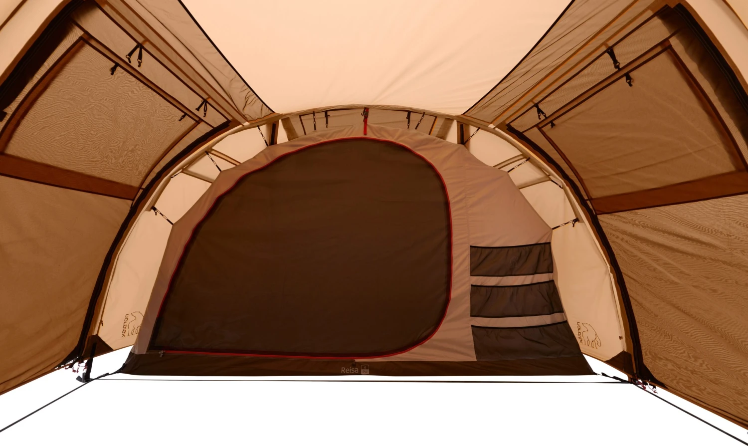 Nordisk Reisa 4 PU er et rummeligt og højt familietelt, som leveres med to sovekabiner, der giver fine overnatningsmuligheder for den større familie. Man kan dog vælge at afmontere fx den mindste kabine, hvormed apsisarealet øges betragteligt, ligesom man hermed kan gøre brug af den store åbning (med bagvedliggende myggenet) i fronten, som med de medfølgende stænger kan løftes op og øge det samlede overdækkede areal. Perfekt, når man om sommeren både vil have masser af luft i teltet og samtidig vil kunne sidde og nyde udsigten i skyggen eller i ly for regnen.