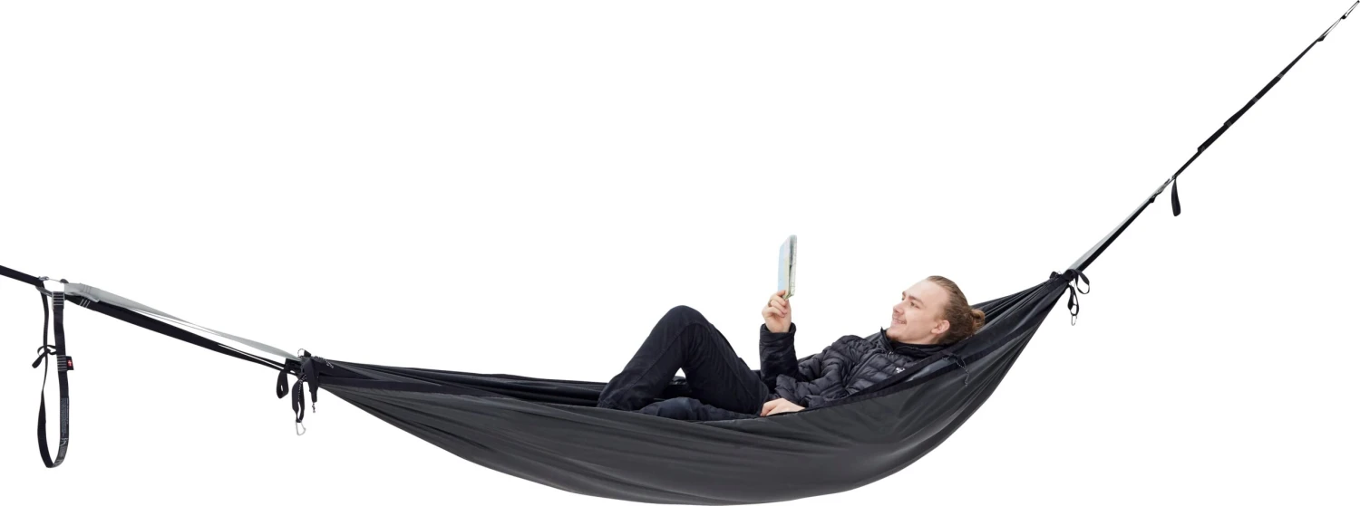 Voss Tech Tarp kan med de medfølgende remme og karabiner som nævnt også bruges som hængekøje med eller uden tag og med mange forskellige konfigurationsmuligheder. Hvis tarpen foldes på midten (med lynlåsen placeret i den øverste del), kan graden af overdække nemt og hurtigt reguleres i forhold til vind og vejr. Alternativt kan den bare lægges fladt ned og bruges som almindelig hængekøje. Et par stykker justerbar rebsnor til fiksering af den øverste del medfølger, hvis hængekøjen bruges med overdække.