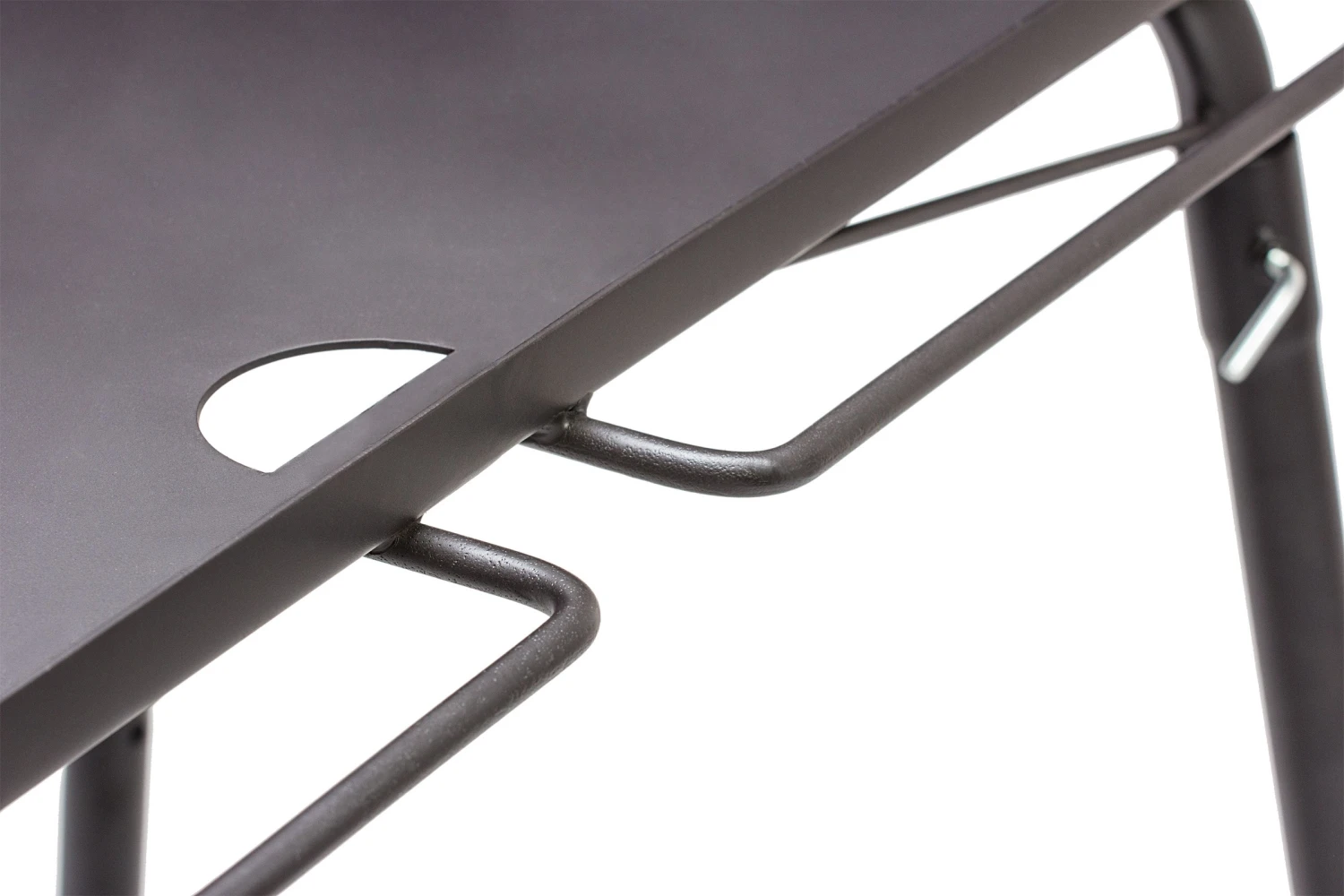 Under madlavningen kan det forskellige køkkengrej, tænger og grillhandsker hænges på siden af bordet, så det hele tiden er indenfor rækkevidde, og hullet forrest på bordpladen gør det nemt og hurtigt at skrabe bordet rent for aske og kulrester.
