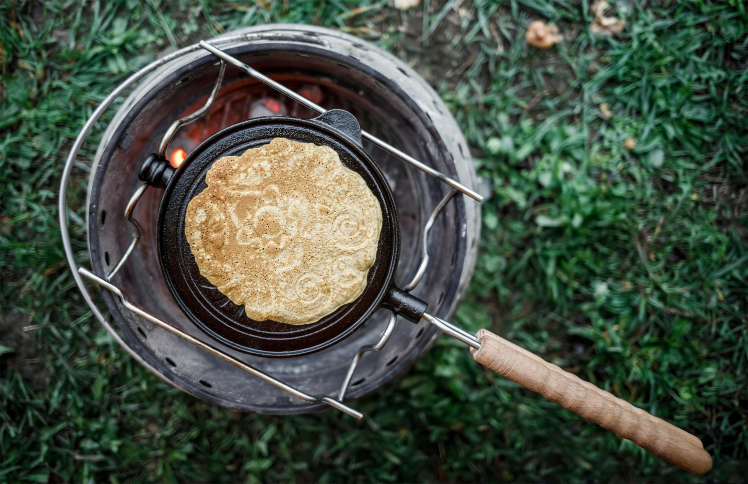 Et ideelt udendørs madlavningssted til Rotating Waffle Iron er i øvrigt Petromax’ egen Atago, for støtterammen til det roterende vaffeljern passer helt perfekt til den øverste kant på Atago, og samtidig er afstanden mellem støtteramme og kulristen tilstrækkelig til at bage vafler med indirekte varme, så du dermed opnår det bedste resultat.