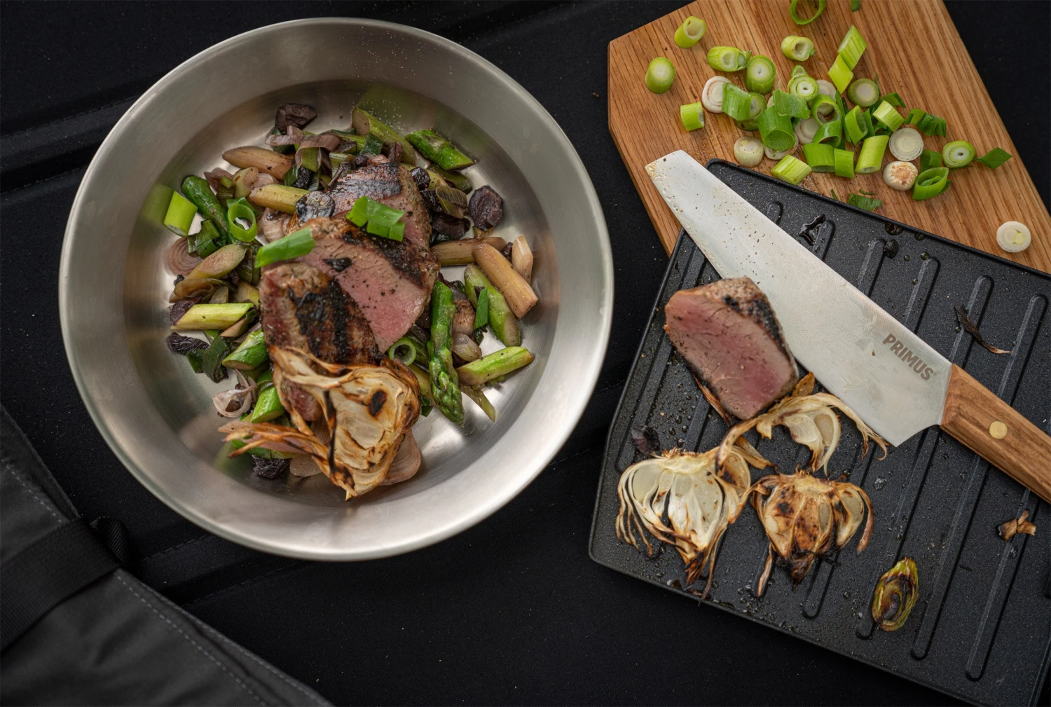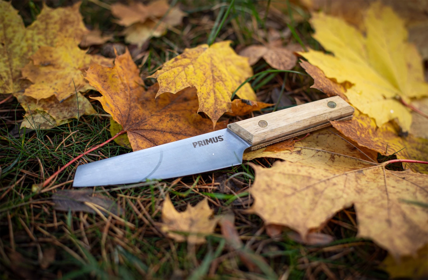 Denne CampFire Knife Large fra svenske Primus er designet som en ordentlig kokkekniv med rustfrit stålblad og egetræsskaft, men i en mindre størrelse for at passe til et friluftsliv.
