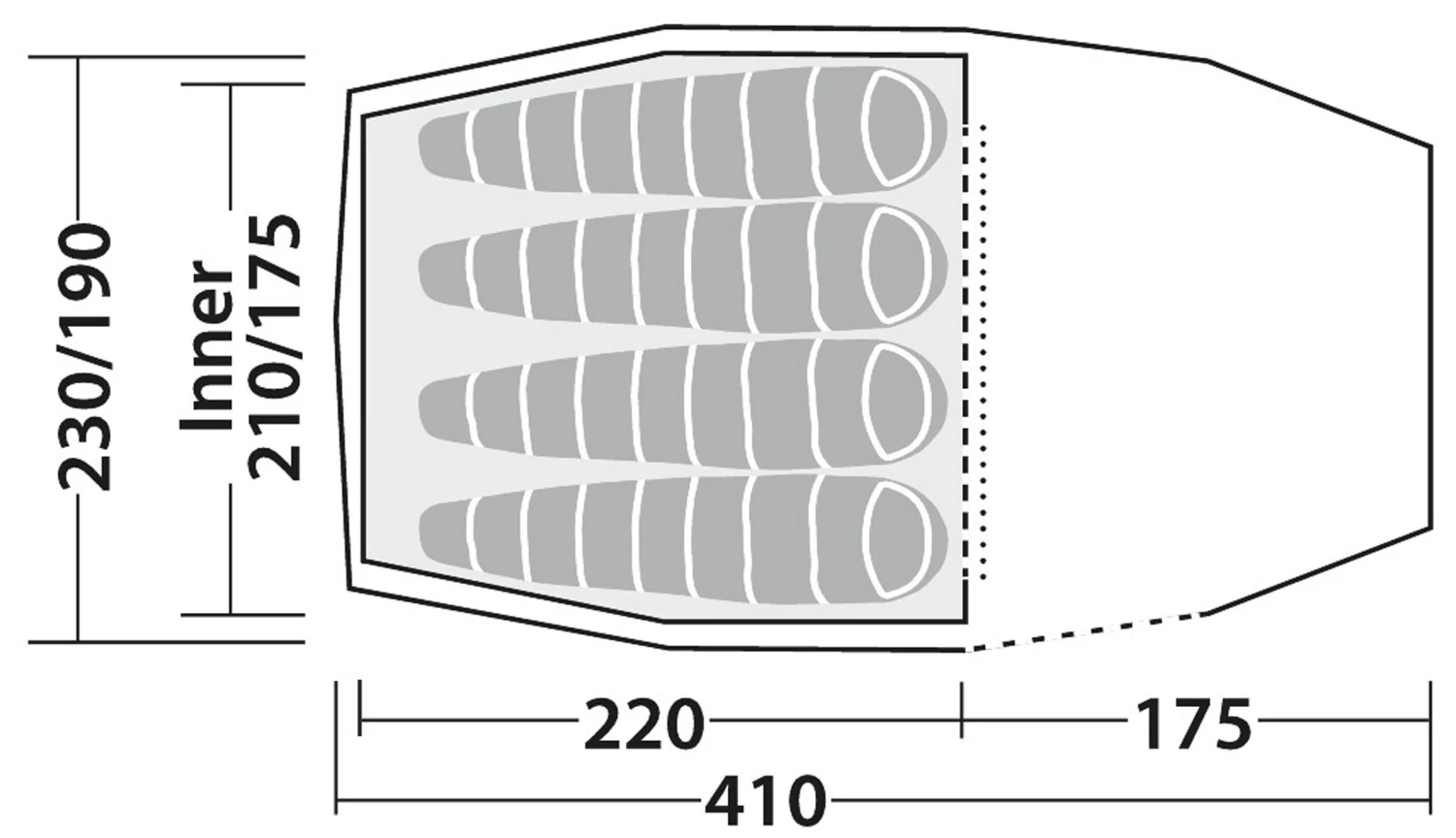Væggene i inderteltet er af imprægneret og åndbart 68 Denier polyester med mesh-paneler ved ventilationsåbningerne og den robuste bund er af en slidstærk 75 Denier Taffeta Polyester, som modstår et statisk vandsøjletryk på minimum 6.000 mm. Inderteltet er udstyret med de rigtige lommer til de personlige ejendele. Døren til inderteltet er lavet med et stort myggenetspanel, som kan dækkes til med et lynlåslukket panel, hvis teltet skal bruges, når det er køligt eller ventilationen skal reguleres.
