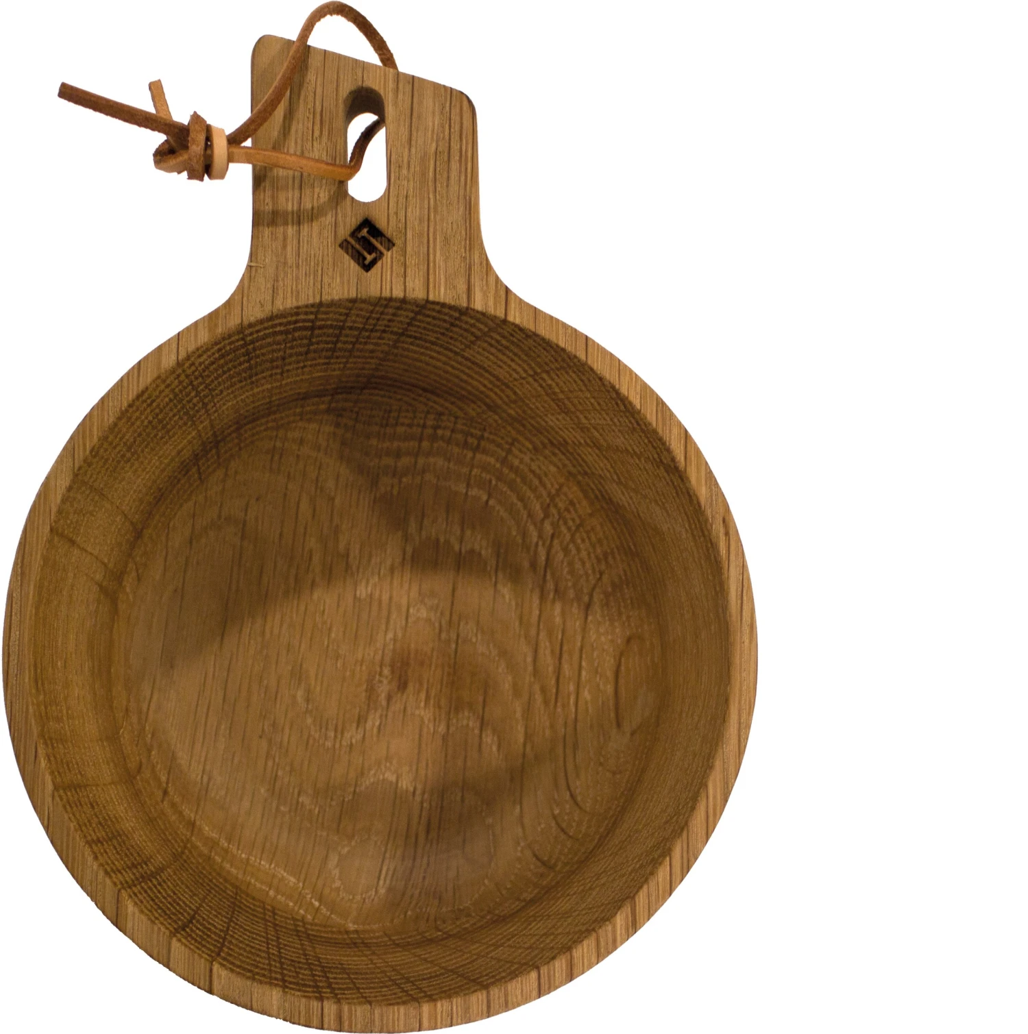 Bowl in Oak Wood, 0.7L er fremstillet med et praktisk håndtag med udfræsning og en stilfuld læderrem, så den fx kan fastgøres på rygsækken.